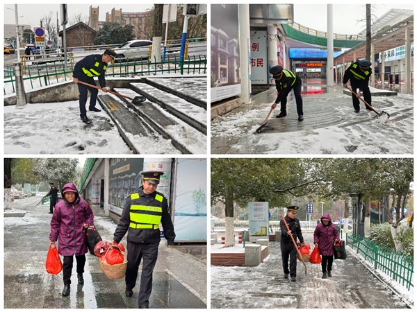 为保障广大旅客安全顺畅出行,市交通运输执法支队三大队二中队闻雪而动,第一时间启动应急预案。中队全体执法人员携带除雪工具,冒着凛冽寒风与持续飘落的雪花,全力开展扫雪除冰工作。