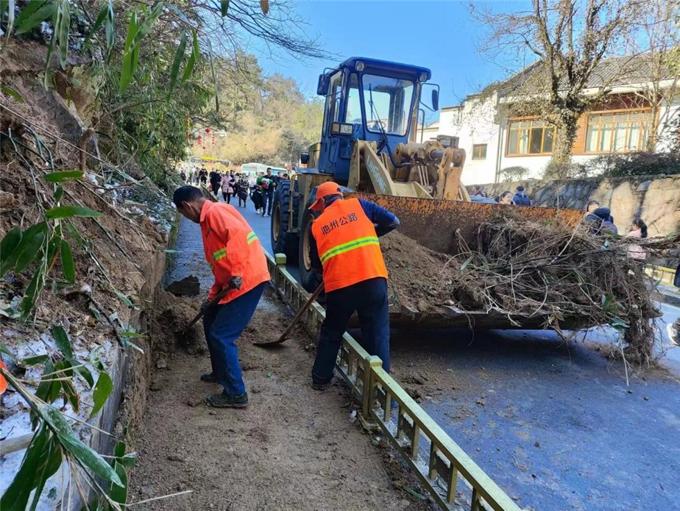 九华山分中心立即启动应急预案,第一时间组织人员奔赴现场,调配抢险机械,以最短的时间清理塌方,恢复交通,确保景区游客安全出行。