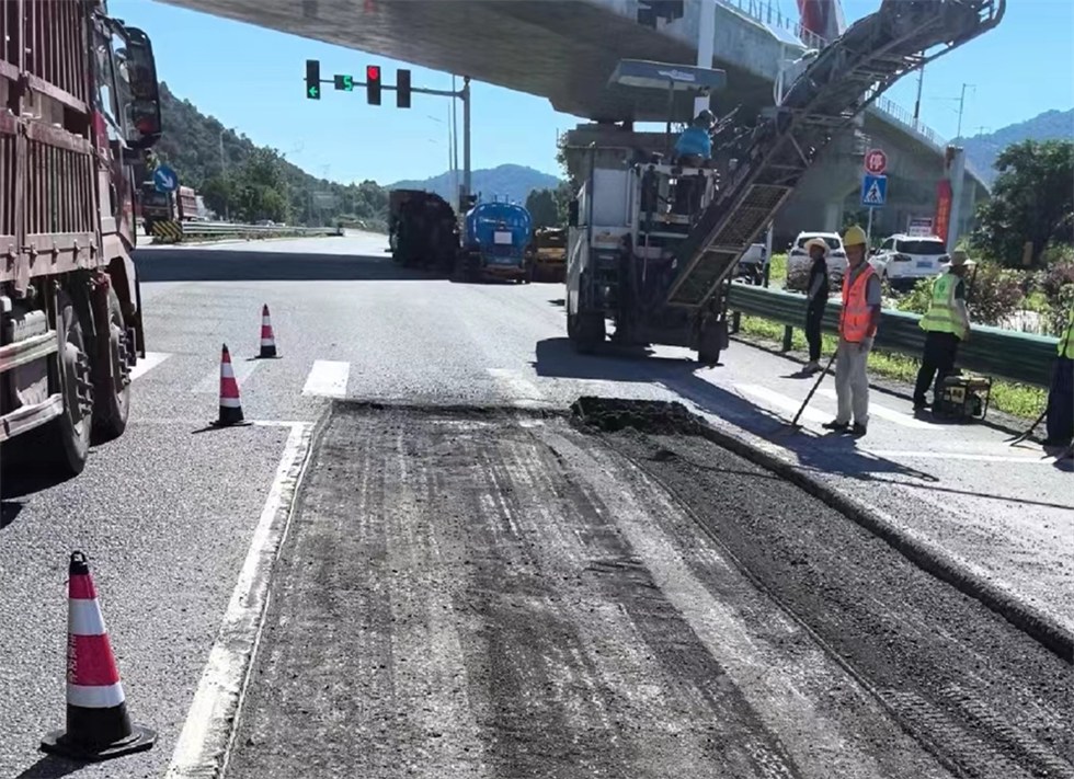 根据路面病害情况排查结果,按照轻重缓解的原则,直属分中心集中力量第一时间处置受损严重路段,同时对其余路段进行应急修复。现场机器轰鸣,施工人员按照养护作业规范标准,规范设置安全作业区,有条不紊实施切割、铣刨、清理、摊铺、碾压等施工工序,切实保障施工安全和施工质量。