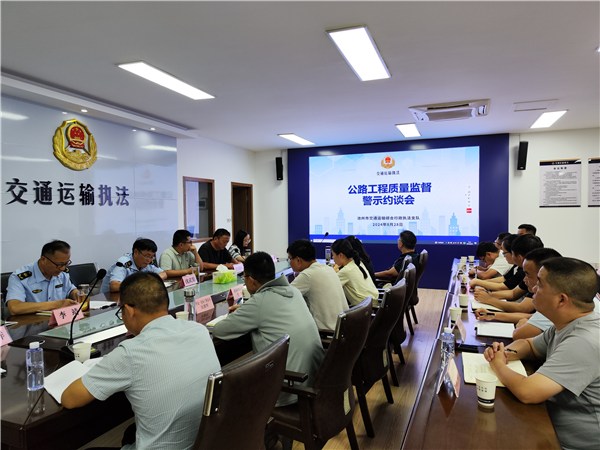 8月28日,池州市交通运输综合行政执法支队召开全市公路工程质量监督警示约谈会,沈武装副支队长主持会议并讲话,公路执法科和项目办负责同志参加会议。