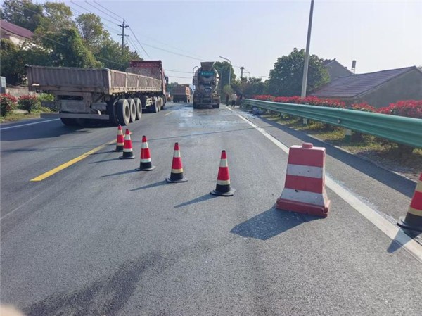 在事件现场,为避免二次事故发生,养护人员首先将油污路面进行临时隔离,禁止过往车辆驶入,并同时做好现场维护工作。