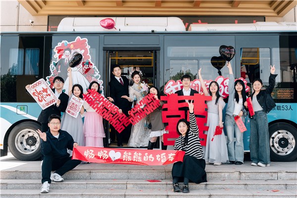该公交车化身为新人畅畅与熊熊的专属婚车,不仅成为两人幸福时刻的见证者,更以其独特的创意和细节装饰,吸引了众多市民的目光。车上挂满了各式“囍”字和新人照片贴画,电子头牌滚动播放着“畅畅LOVE熊熊的婚车”字样,甜蜜的标语“我爱老婆,老婆宠得好,招财又进宝”更是彰显了两人之间的深厚爱意。