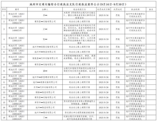 池州市交通运输综合行政执法支队行政执法案件公示(9月16日-9月30日)