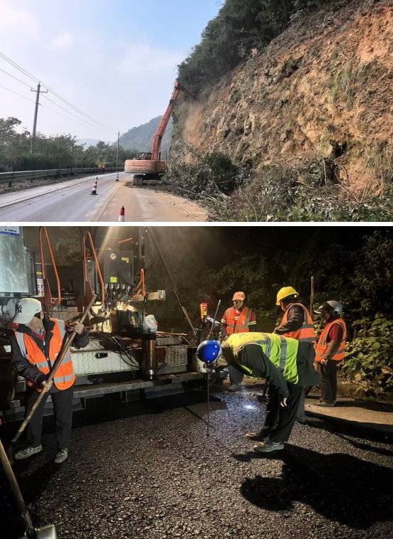 此次灾毁恢复重建项目涵盖路面修复、边坡防护、桥梁维修等关键内容。S225池太路是贵池区矿产品运输的重要“动脉”,也是沿线群众出行的重要通道。为提升建设效率,降低安全隐患,直属分中心提前科学策划、精心部署,采用“半幅封闭施工、单向交替通行”模式,高效推进沿线边坡清表与护栏安装作业;同时充分利用夜间时段开展路面铣刨、摊铺作业,最大程度减少施工对周边居民生活、企业生产的影响。