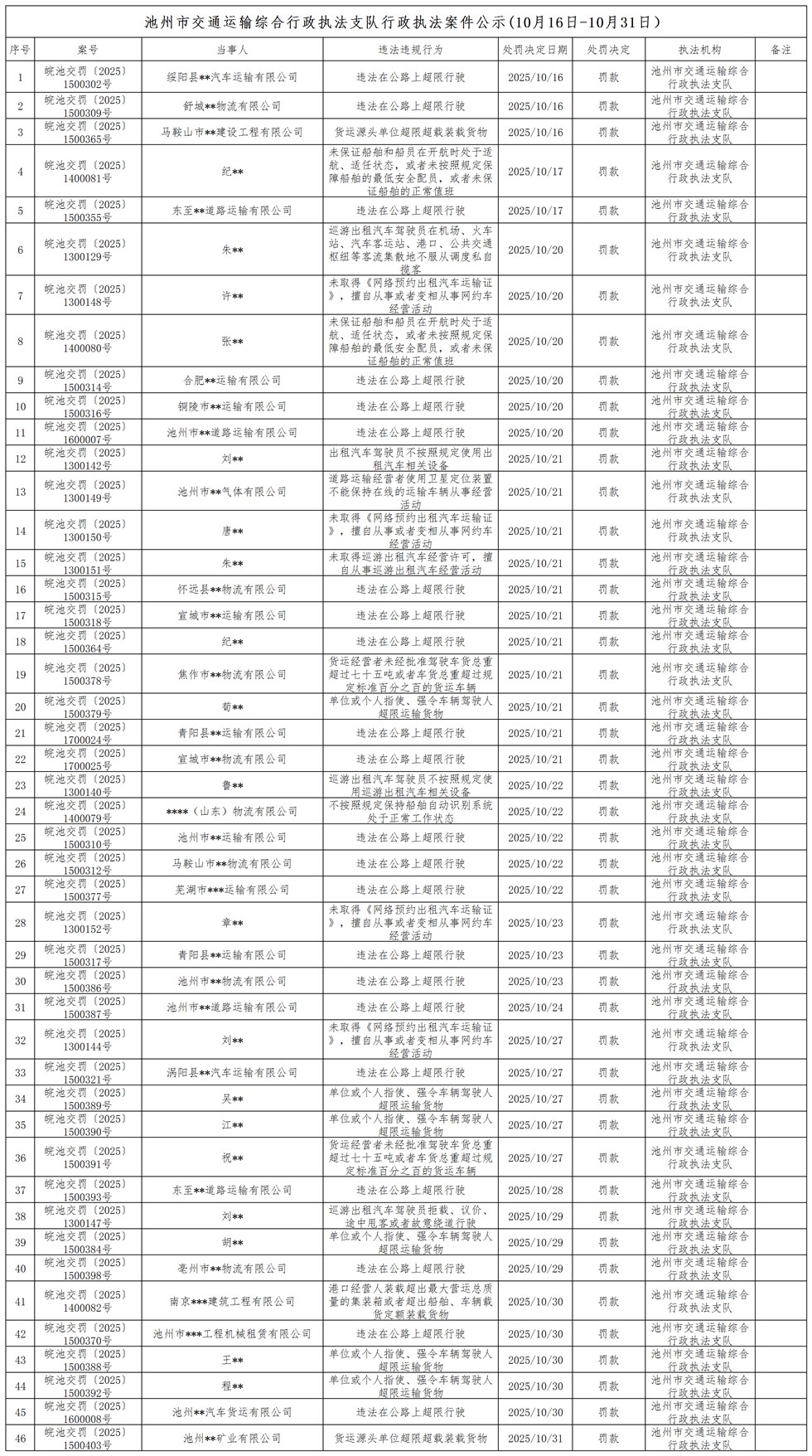 池州市交通运输综合行政执法支队行政执法案件公示(10月16日-10月31日)