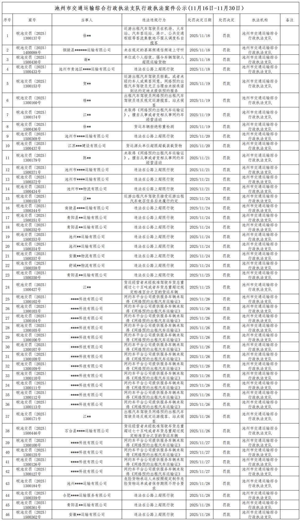 池州市交通运输综合行政执法支队行政执法案件公示(11月16日-11月30日)