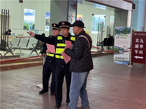 宪法进机关,组织科级以上领导干部在线参加宪法知识测试,利用办公场所及相关区域LED屏滚动播放宪法宣传标语,积极营造尊崇宪法、践行宪法的法治氛围,引导执法人员将宪法精神融入日常执法;宪法进场站,执法人员走进池州高铁站出站口、墩上超限超载检测站等地,向旅客及道路运输从业者发放普法资料,进行面对面宣传。