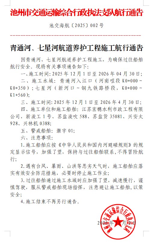 青通河、七星河航道养护工程施工航行通告