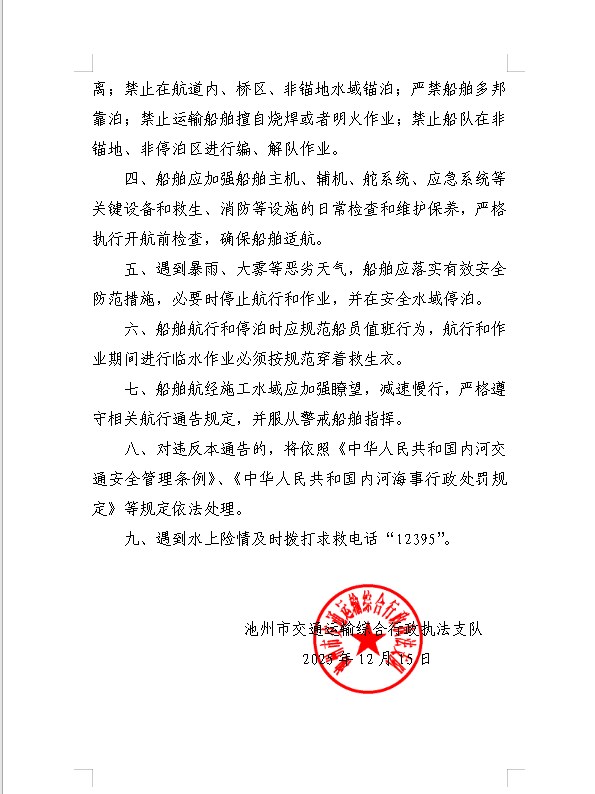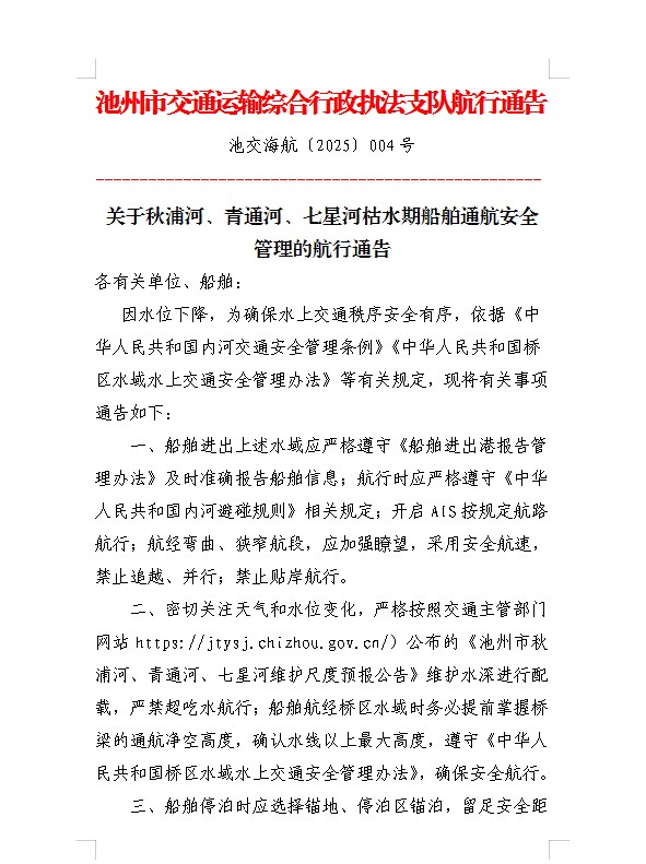 关于秋浦河、青通河、七星河枯水期船舶通航安全管理的航行通告