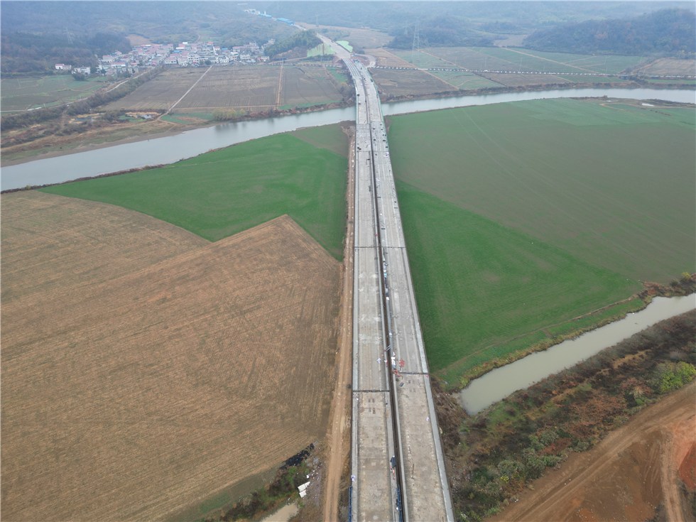 张溪大桥位于池州市东至县张溪镇境内,为本项目控制性工程之一,桥梁左右全长均为982m,上部结构标准跨径采用30m先简支后连续组合箱梁,跨河主桥采用(65+110+65)m变截面连续箱梁,跨堤主桥采用(33+55+33)m变截面连续箱梁,预制箱梁共计 168 片,20m(8片)、22m(4片)、25m(4片)、30m(140片)、31m(12片),其中31m预制箱梁采用220t+300t汽车吊进行安装,其余箱梁均采用JQJ120-30 A3架桥机进行架设,本次预制箱梁架设任务的顺利完成,意味着大桥主体结构已完全成型,全面进入桥面系施工阶段。