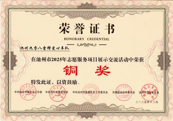 一系列扎实的公益实践,让车队收获了市级认可。12月4日,池州市第一届志愿服务大赛落下帷幕,池州九零八雷锋爱心车队凭借“绿丝带爱心助学”项目的扎实成效,成功斩获铜奖。