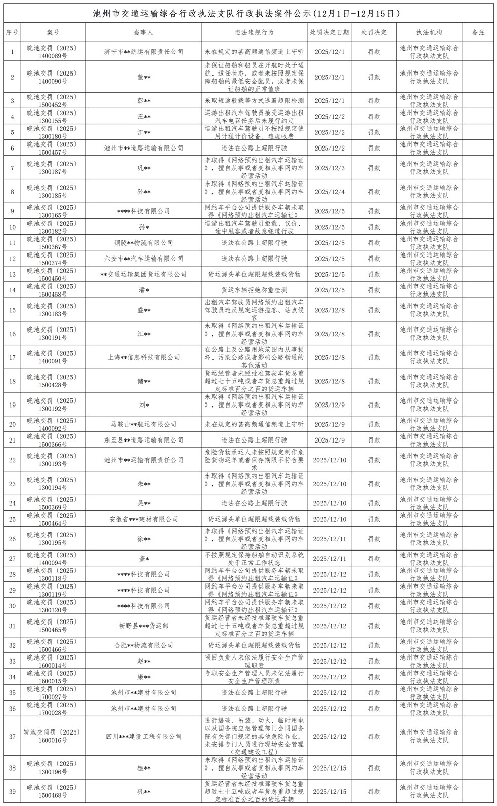 池州市交通运输综合行政执法支队行政执法案件公示(12月1日-12月15日)
