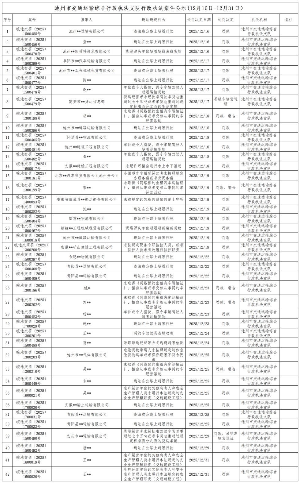池州市交通运输综合行政执法支队行政执法案件公示(12月16日-12月31日)
