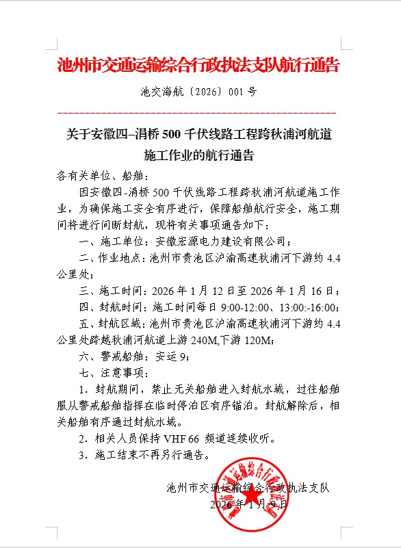 关于安徽四-涓桥500千伏线路工程跨秋浦河航道施工作业的航行通告