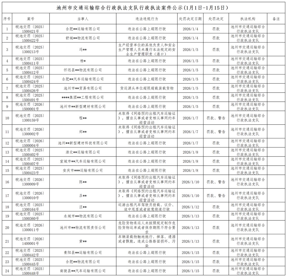 池州市交通运输综合行政执法支队行政执法案件公示(2026年1月1日-1月15日)