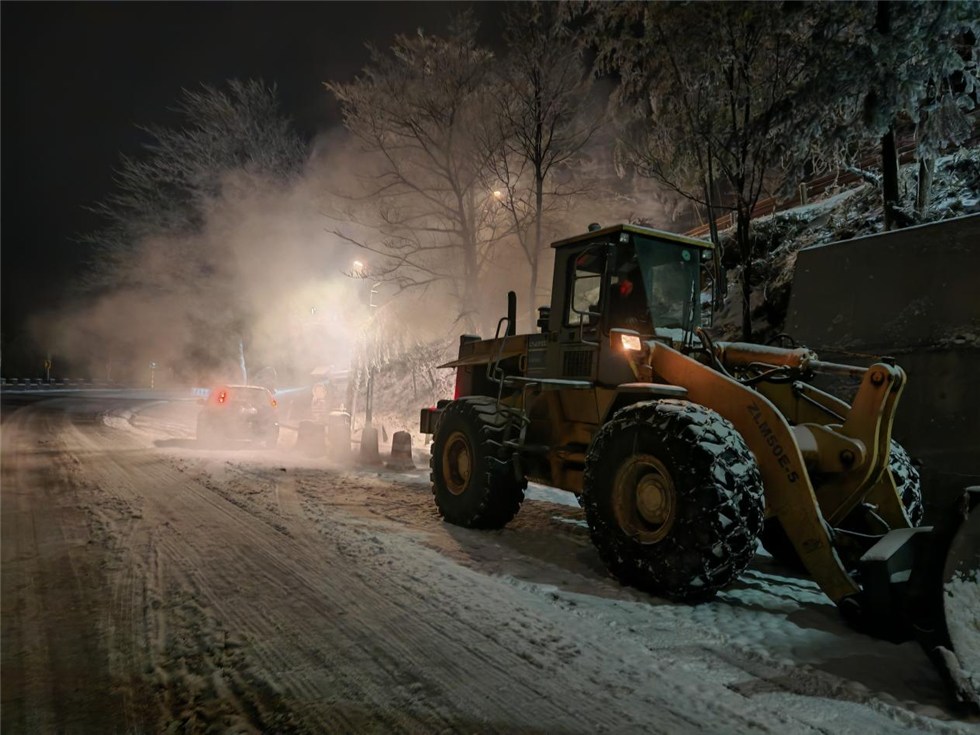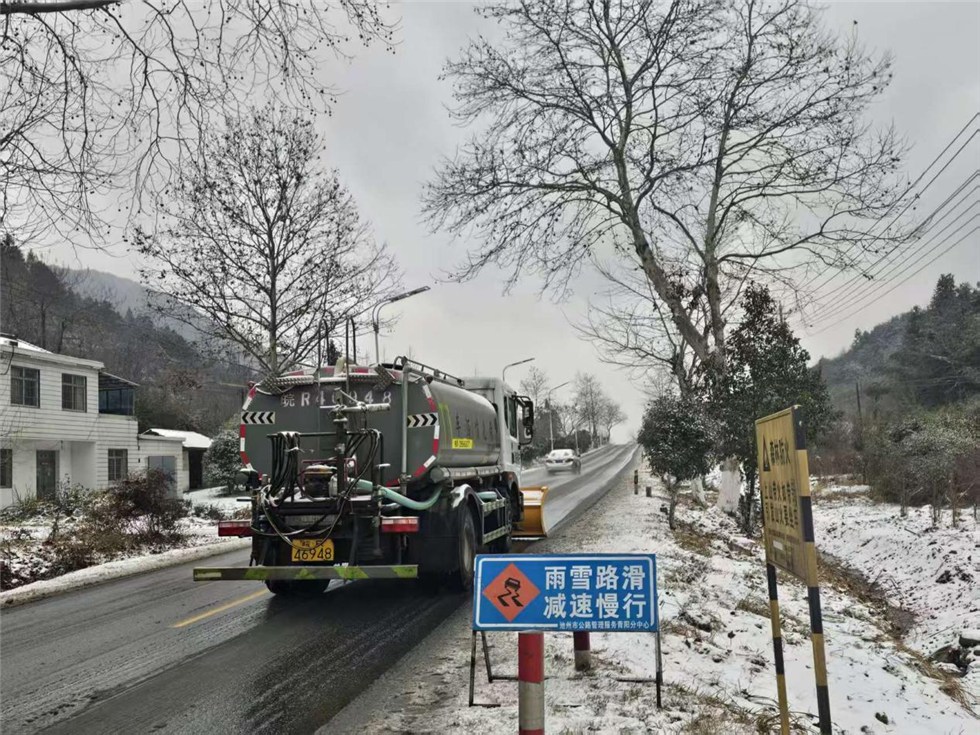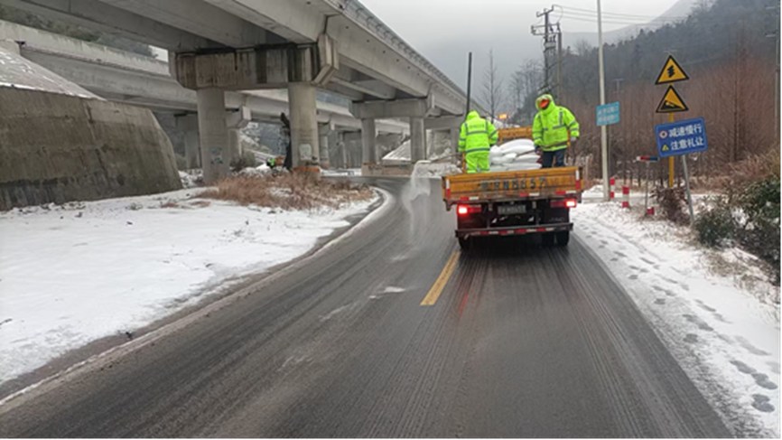 截至目前,九华山分中心累计出动人员45人次、机械10台班,撒布融雪剂16吨,有效遏制道路结冰蔓延,确保了景区主干道及关键节点的安全畅通。
