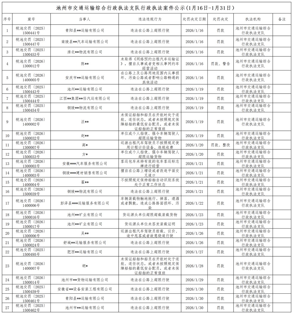 池州市交通运输综合行政执法支队行政执法案件公示(1月16日-1月31日)