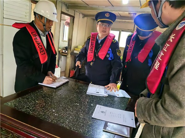严查施工船舶,筑牢安全防线。检查组重点对码头前沿水域施工船舶开展登船检查。执法人员对照船舶各项证书,逐项核验船舶实际状态是否与证书记载一致,核查船员证书是否齐全有效、是否人证相符。同时向船员宣传内河船舶防污染规定,要求施工船舶严格落实油污水、生活垃圾分类收集处置要求,利用“示踪剂”检查船舶是否存在偷排污水现象。
