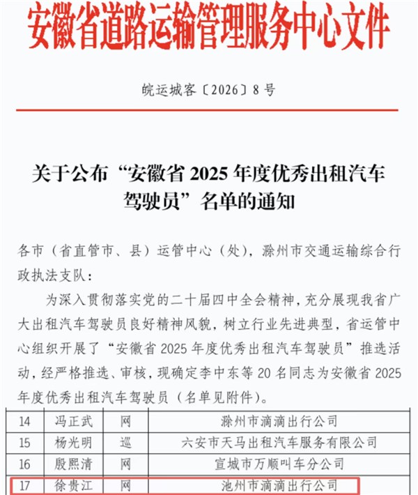 “安徽省2025年度优秀出租汽车驾驶员”评选结果正式揭晓,池州市滴滴出行公司驾驶员徐贵江成功入选,为我市出租汽车行业赢得荣誉、树立标杆。从业以来,徐贵江始终坚守岗位初心,热心帮扶群众,曾主动为困难乘客减免车费、雪夜免费护送群众回家,多次帮扶残障人士、老人小孩过马路,还曾在交通事故现场及时报警,为伤者争取救治时间,用点滴善举彰显行业担当。